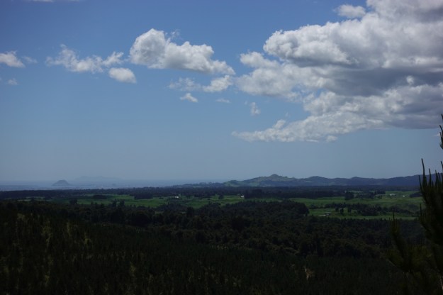 In a northerly direction Mt Maunganui/Mauao can be seen clearly to the left, with a faint outline of Mayor Island/Tuhua in the distance to the right of Mauao.