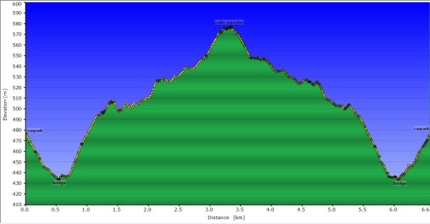 Radio repeater to carpark, with a couple of short side tracks: 3.2 km, 41 minutes.