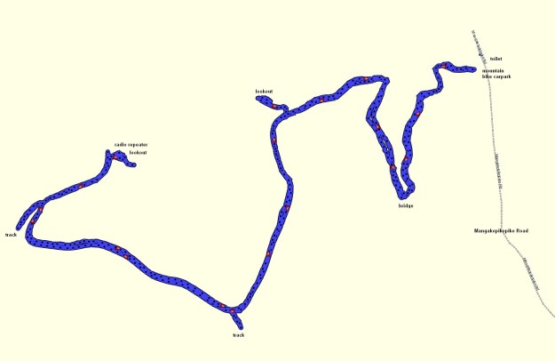 The tracklog shows the tracks followed, starting and ending at the carpark on the far right, and with the radio repeater and lookout to the left of centre. Time was spent looking for the lookout with no views by the North West Trail Head. The times and distances (excluding the North West Trail Head lookout) were: