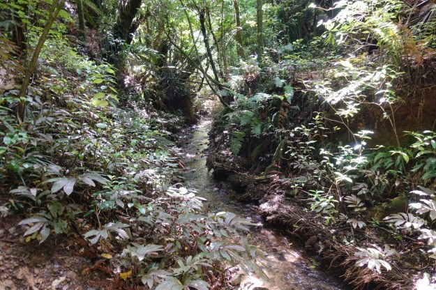 The track follows the stream for a short distance before starting the climb to the trig at the summit of Maungakawa. Most of the vegetation consists of smaller trees in regenerating native forest.