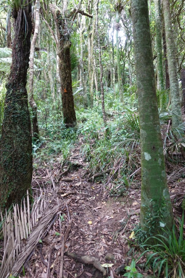 The track is overgrown in places, with only the orange triangular markers on some of the trees to show the way.