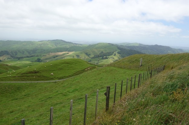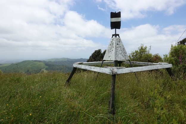 The track emerges from the bush and follows a fenceline for a short distance before once again heading off into the bush for the climb to just below the summit. The masts can be seen at the top of the hill by the bush boundary. There was a live electric fence wire on the other side of the fence.
