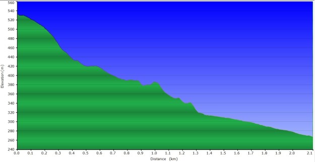 Following the fenceline instead of following the walkway made the return considerably shorter, at 2.3 km including about 750 metres walking along Ohinewai Rd back to the track start location. The time was also much shorter, at 1 hour 10 minutes. The GPS tracklog shows the fenceline and Ohinewai Road route back, with the elevation chart showing the distances and elevation changes.