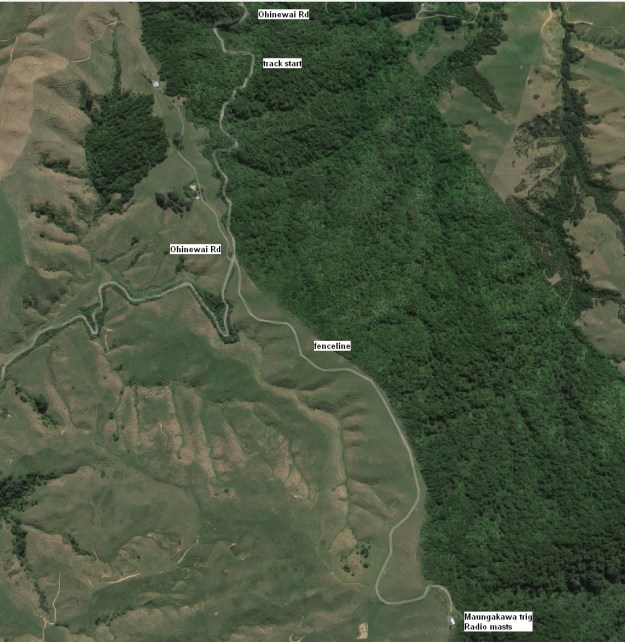 Instead of returning to Ohinewai Road by the walkway it is possible to follow the fenceline all the way from the summit to Ohinewai Road. This is considerably shorter and faster than the official track through the bush.