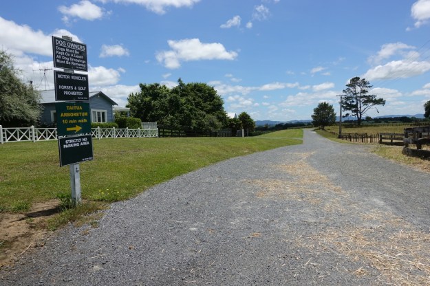 The entry to Taitua Arboretum at the end of Taitua Road, with a parking area on the left.