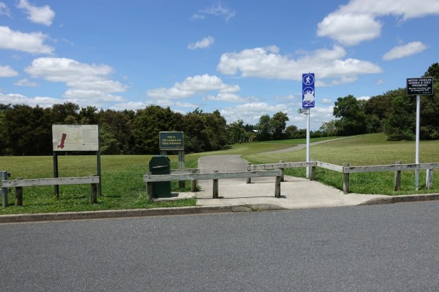 The entry off Melva Street to Till’s Lookout, Te Araroa Trail, and the track to Taitua Arboretum. The dog exercise area is off to the left.