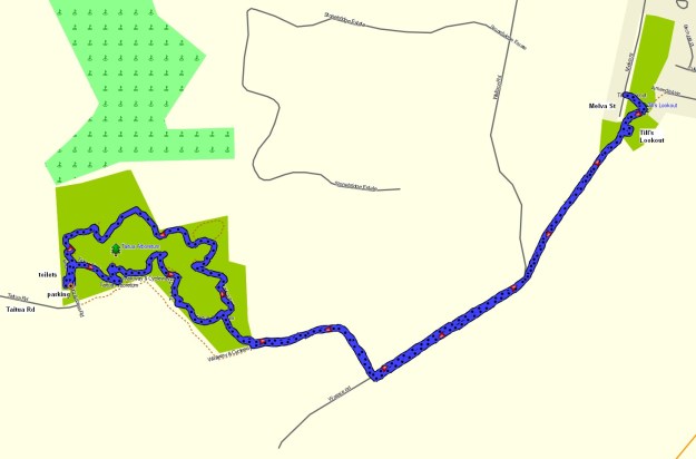 The GPS track log shows the routes followed, including both the arboretum and the branch off to Till’s Lookout. The arboretum track on its own was 2.3 km long, and took 40 minutes. The side track to the lookout and to Melva Street was a total of 4 km (2 km each way) and took 50 minutes. Note that not all the tracks in the arboretum were walked on this occasion.