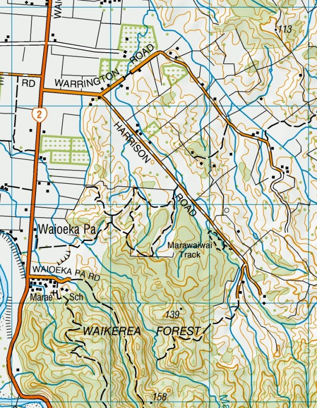 The GPS tracklog shows the location of the track relative to SH2, Warrington Road, and Harrison Road. The track, from reserve entry and back, is about 700 metres long, and took just under 15 minutes to walk, including time for photos. There are only very gentle inclines on the track. The most memorable feature of the walk was actually the impressive birdsong which could be heard all the way around the track.