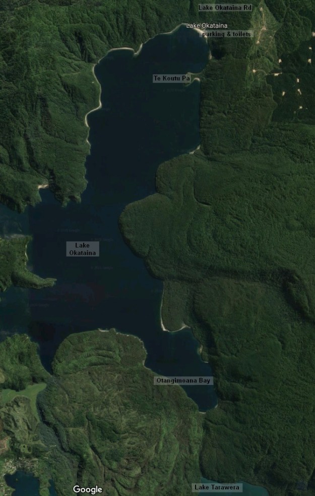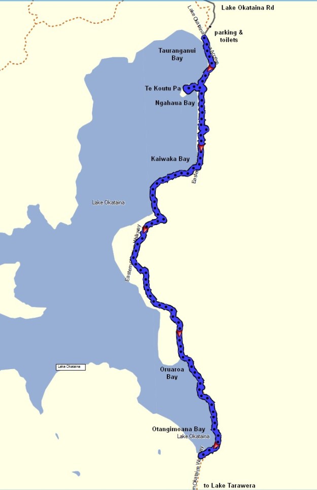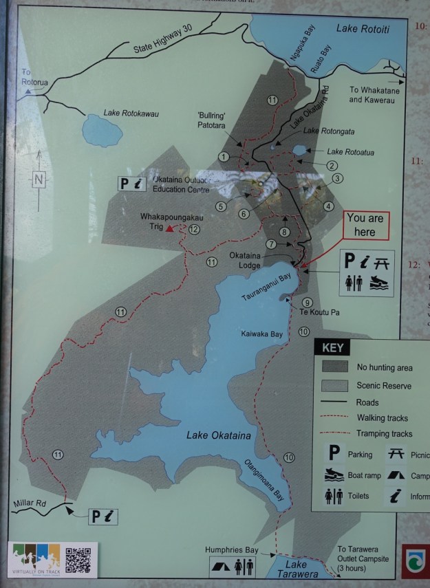 Due mainly to time constraints this walk was done from the carpark at the end of Lake Okataina Road, turning around and returning from Otangimoana Bay, just before the start of the saddle across to Lake Tarawera. It included a side track to Te Koutu Pa. Total distance walked was 18.1 km, with 9.6 on the outbound leg which included the pa site, and 8.5 on the return. Time was almost 3 hours outbound and 2 hours 30 minutes on the return. According to DoC the extra crossing to Lake Tarawera from Otangimoana Bay would add about 1 km and 20 minutes in each direction. That last part will have to wait for a time with more daylight hours.