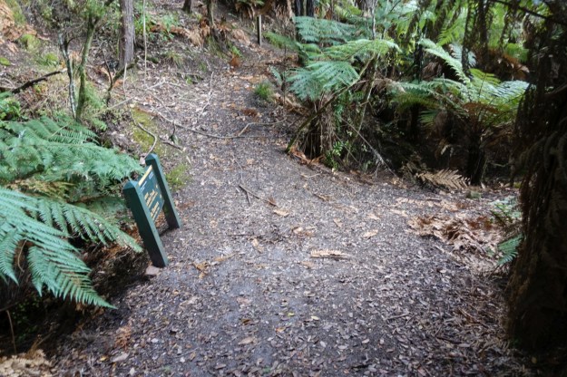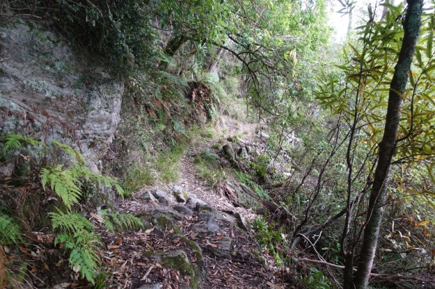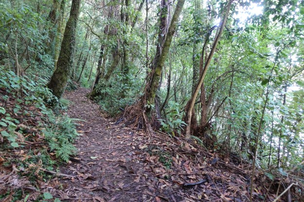 In several places there are tree roots across the track, making it slippery, especially when wet. Here the start of one of the steeper descents back down to lake level.