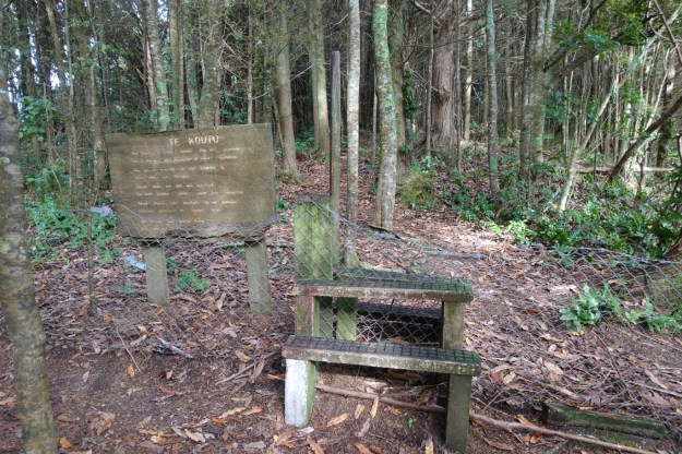From the beach a track on the right accesses Te Koutu Pa. A fence crosses over the peninsula to keep out animals, and a sign which can be difficult to read mentions some storage holes which can still be seen on the edges of the pa site.
