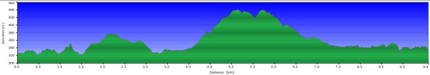 The profile shows the height variations along the southbound leg of the walk, The lake level is about 325 metres above sea level, and the highest point on the track about 440 metres asl.