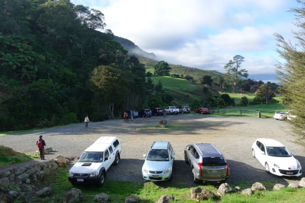The parking area at the end of Waiorongomai Road. There is also a basic DoC toilet, and track information panels nearby.