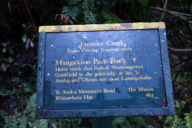 The old sign at the start of the link track. The track has presumably been shortened since this sign was written, as the walk to Te Aroha Mountain Road (Dog Kennel Flat) only took about 50 minutes.