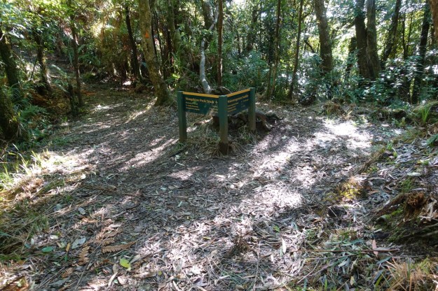 The DoC sign at Dog Kennel Flat junction, at the top end of the link track. The track to the left is the steep walking track to the summit of Mt Te Aroha, a walk of about 35 minutes, and to the right is Dog Kennel Flat by the side of Te Aroha Mountain Road, and the upper end of Tui Saddle Track.