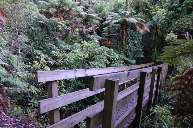 A short wooden bridge marks the end of Piako County Tramway. The link track starts at the far end of the bridge.