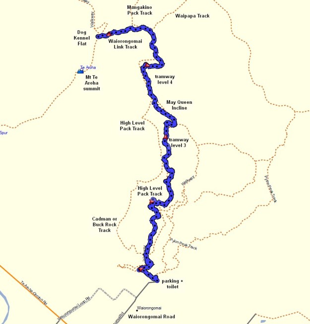 This walk was done using the tracks giving the easiest walk to the upper end of the Piako County Tramway. For details about the tracks in the Waiorongomai Valley and the Mt Te Aroha tracks at Dog Kennel Flat please see the other entries on this site, especially Waiorongomai Valley – High Level Pack and Cadman Tracks, Buck Rock, Low Level Drive; Waiorongomai Valley – Piako County Tramway; and Tui Tracks to Mt Te Aroha Summit. The initial climb was to the top of Fern Spur Incline, then up the High Level Pack Track to the top of Butlers Incline, Piako County Tramway level 3 to the May Queen Incline, up the incline, and along level 4 of the tramway to the start of the link track.
