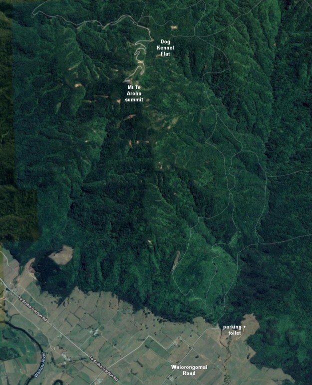 The link track, known as Te Aroha Link Track or Waiorongomai Link Track, also connects to Waipapa Track and Mangakino Pack Track. It is about 1.9 km long, and steep in places, mainly near the tramway end of the track. This walk was done starting and ending at Waiorongomai, turning around at Dog Kennel Flat.