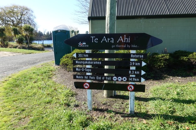 The cycleway Te Ara Ahi runs along Okaro Road past the campground, lake, and toilets. The original toilets were closed, and replaced with temporary portable toilets.