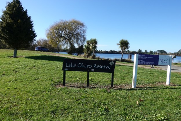 Lake Okaro Reserve, with the campground on the left and behind the trees, and the boat ramp hidden behind the signs on the right.