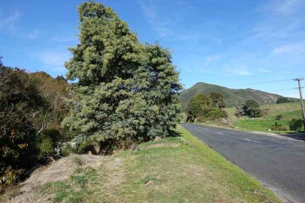 Looking back from Okaro Road, the track heads down to the left beside the tall wattle trees.