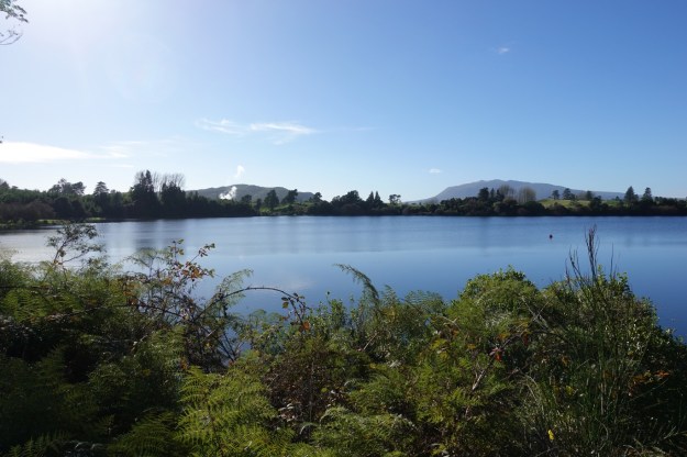 Looking across the lake towards the Waimangu thermal area at the northern end of Okaro Road. The steam from the thermal area can be seen. The campground is on the far left edge.