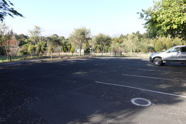 The parking area at Centennial Park. The Rotorua Walkway continues through the park from the gates at photo centre.