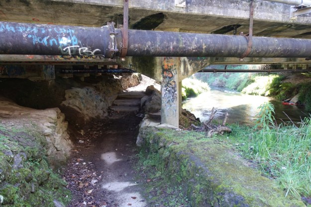 Coming down the steps from Pukehangi Road the walkway continues straight ahead, but there is apparently a walkway continuing under the bridge and heading south alongside the stream.