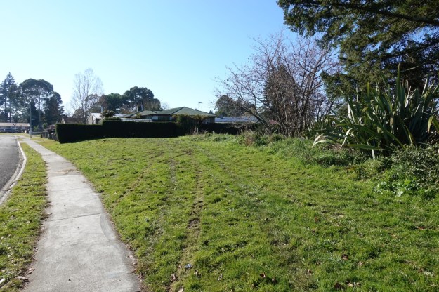 Almost directly across McDowell Street from Jackson Park the route runs along Simmonds Crescent for about 50 metres before the entry to Tihi Rd Reserve, seen between the two hedges.