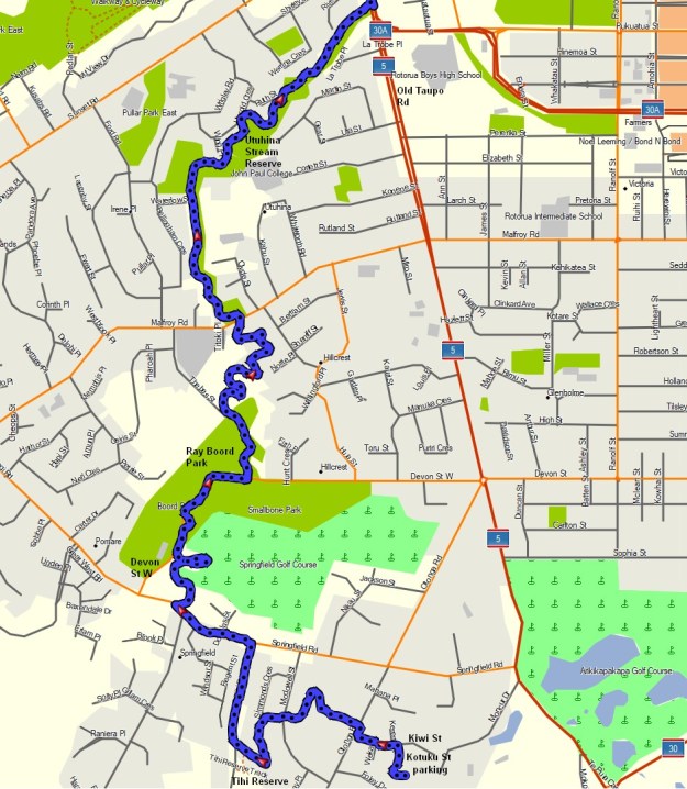The Rotorua Walkway is a 26 km long walkway in Rotorua, broken up into 8 shorter sections. The walkways are described in the brochure Rotorua Walkways available on the Rotorua Lakes Council web site, under the Brochures heading. This walk covers the section named Utuhina in the brochure. It follows the Utuhina Stream for most of the way between Old Taupo Road near Pukuatua Street and the entry to Rotorua Tree Trust Centennial Park, on Kotuku Street, off Kiwi Street and Otonga Road. Two side tracks off the Rotorua Walkway, one of them joining Utuhina Walkway, were described in the previous post, Mangakakahi and Otamatea walkways, Rotorua.
