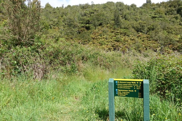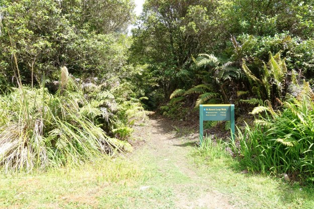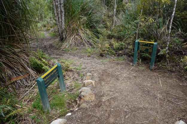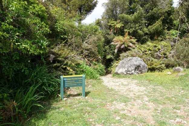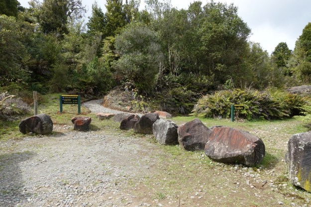 The entry for walking the loop in a clockwise direction is from the car park, by the sign on the left. There is a basic DoC toilet off to the right.