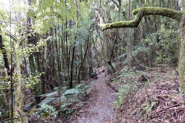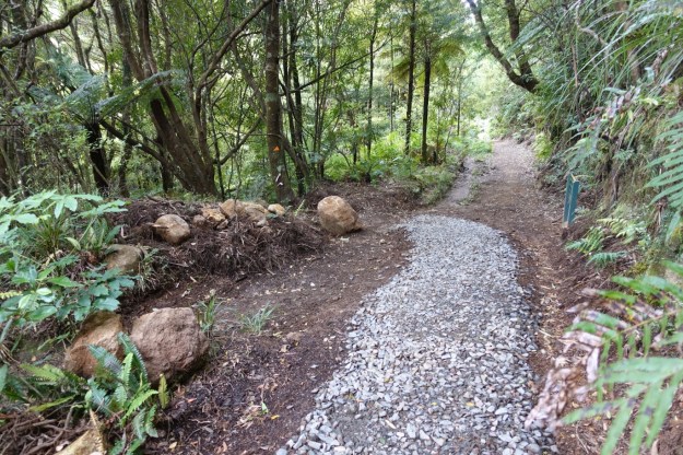 The Pā Kererū track mainly follows the old Poripori and Leyland O’Brien tramlines, with very easy gradients and bridges over stream crossings. The walking time is marked as 40 minutes for the loop, starting and ending at the Bulldozer Blade Clearing at the southern end of Whakamarama Road.