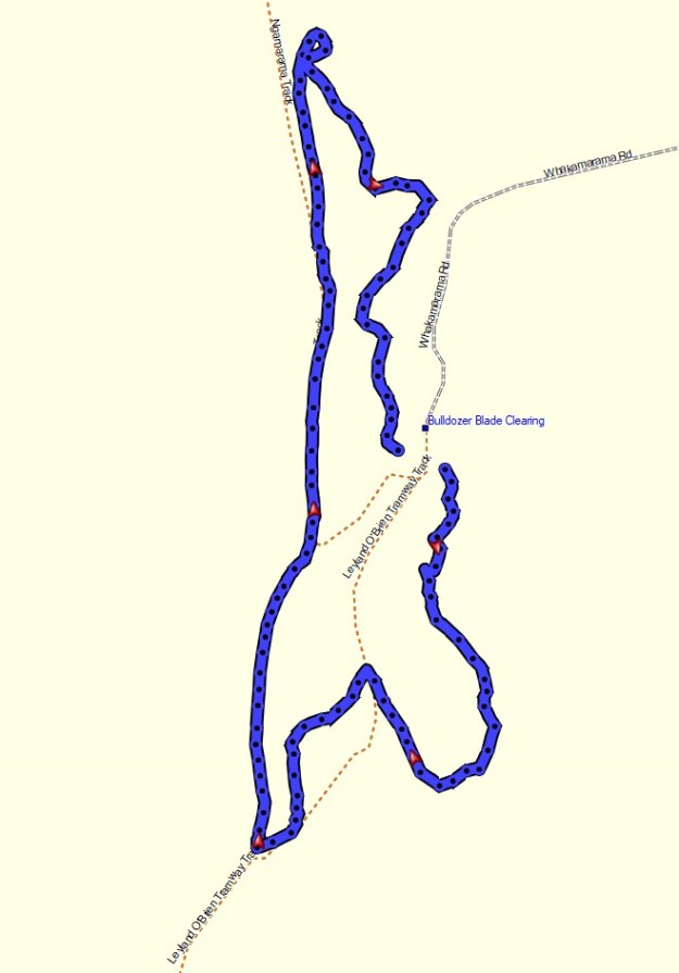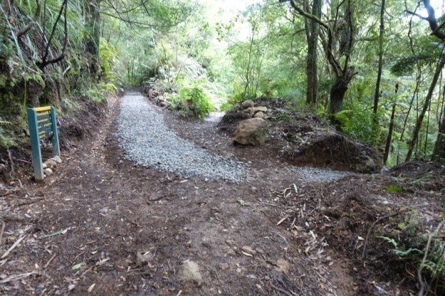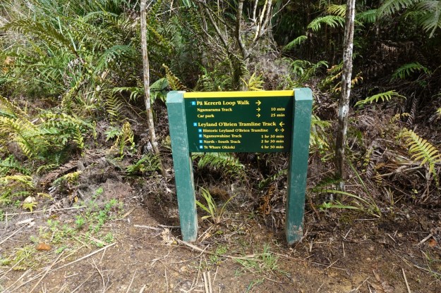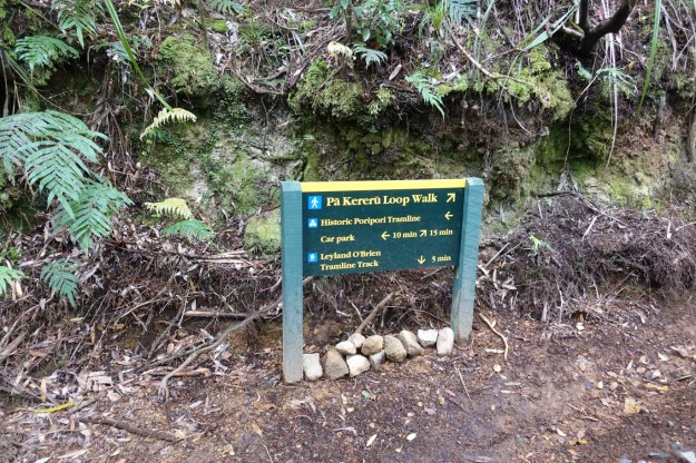 One of the first intersections is 4-way, with one heading sharply backwards to the left, one at about a right angle to the left, and the Poripori tramline straight ahead. The sharp left one is the old track to the Leyland O’Brien tramway, joining up later with the Pā Kererū loop. The right angle left is the loop walk, and the one straight ahead leads back via the tramline to the parking area.