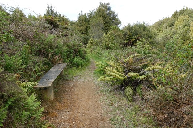 A bench seat provides a resting area along the loop track, with views across a small valley.