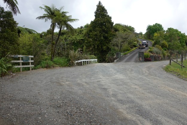 A narrow gravel road with only one vehicle width and only a few places to meet oncoming vehicles continues on for about 1 km from the apparent end of Whakamarama Road. The road continues alongside the railing at the centre of the photo, to the left of the driveway seen heading on up the hill. A sign on the left warns of a narrow 950m long road with possible oncoming traffic.