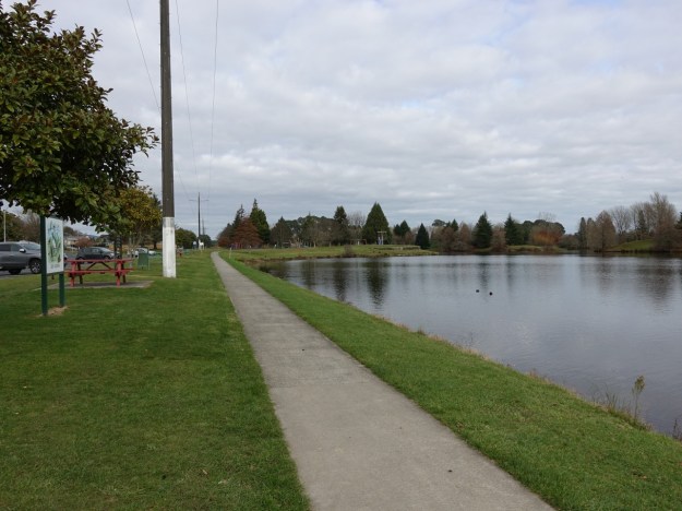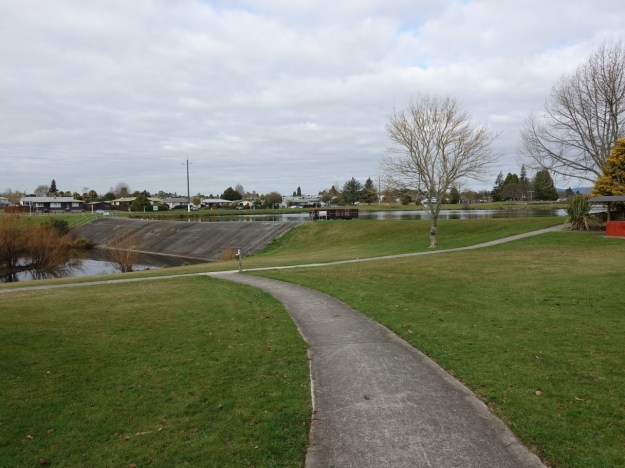 Arawa Crescent, seen with the parking area on the left, borders the eastern side of the lake. The concrete pathway runs all the way around the lake. A large children’s playground is located by the trees at the centre of the picture.