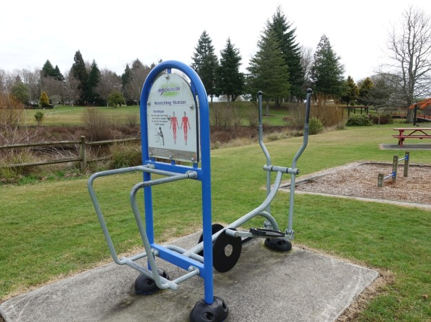 Some of the exercise equipment at the northern end of the lake. There are also picnic tables in several locations, on both sides of the lake. A bridge across Matarawa Stream can be seen at the far right.