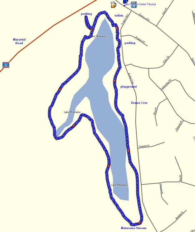 The total length of the pathway around Lake Moananui is about 2.5 kilometers, with a 65 meter long side path to the parking area on Maraetai Road. Total time, Including time to try some of the exercise equipment, walk to and from Maraetai Road, take photos, and chat to a local resident, was about 45 minutes. The GPS tracklog shows the route, which was walked in an anti-clockwise direction. The side track to Maraetai Road is seen at the northern end.
