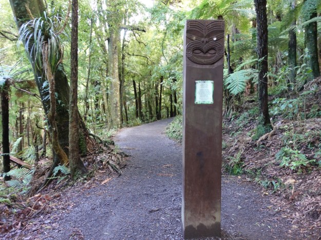 A carved Pou greets visitors to the Waireinga/Bridal Veil Falls. The plaque has a greeting in Maori, and an English text that reads “We greet all of you who come from near and far to this special place. Step lightly and enjoy.”