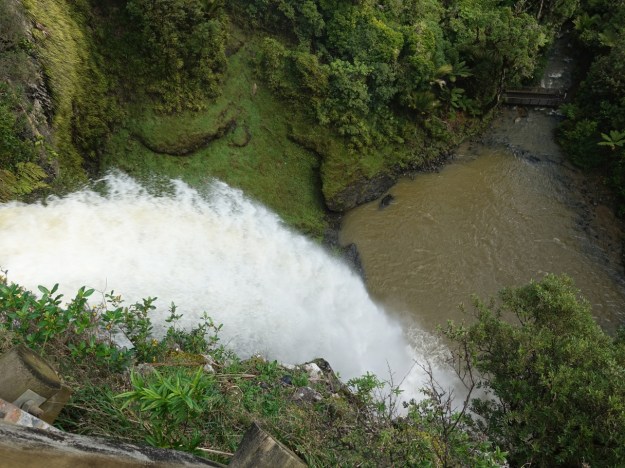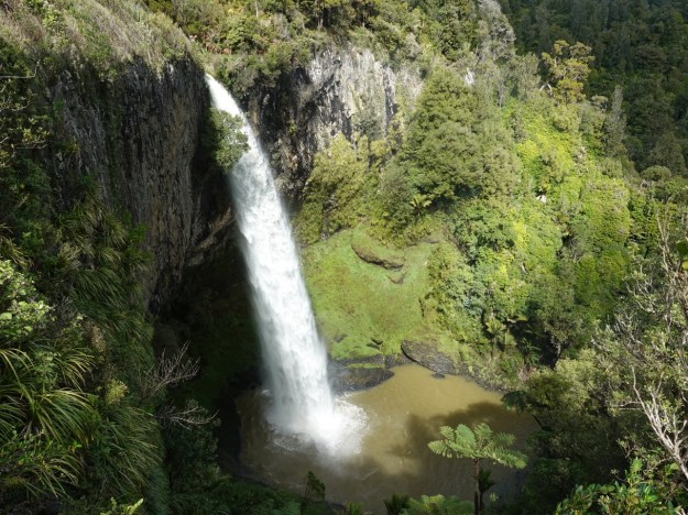 Looking directly down the waterfall from the top of the falls viewing platform. The bridge across Pakoka River at the bottom of the falls can be seen in the top right hand corner of the photo.