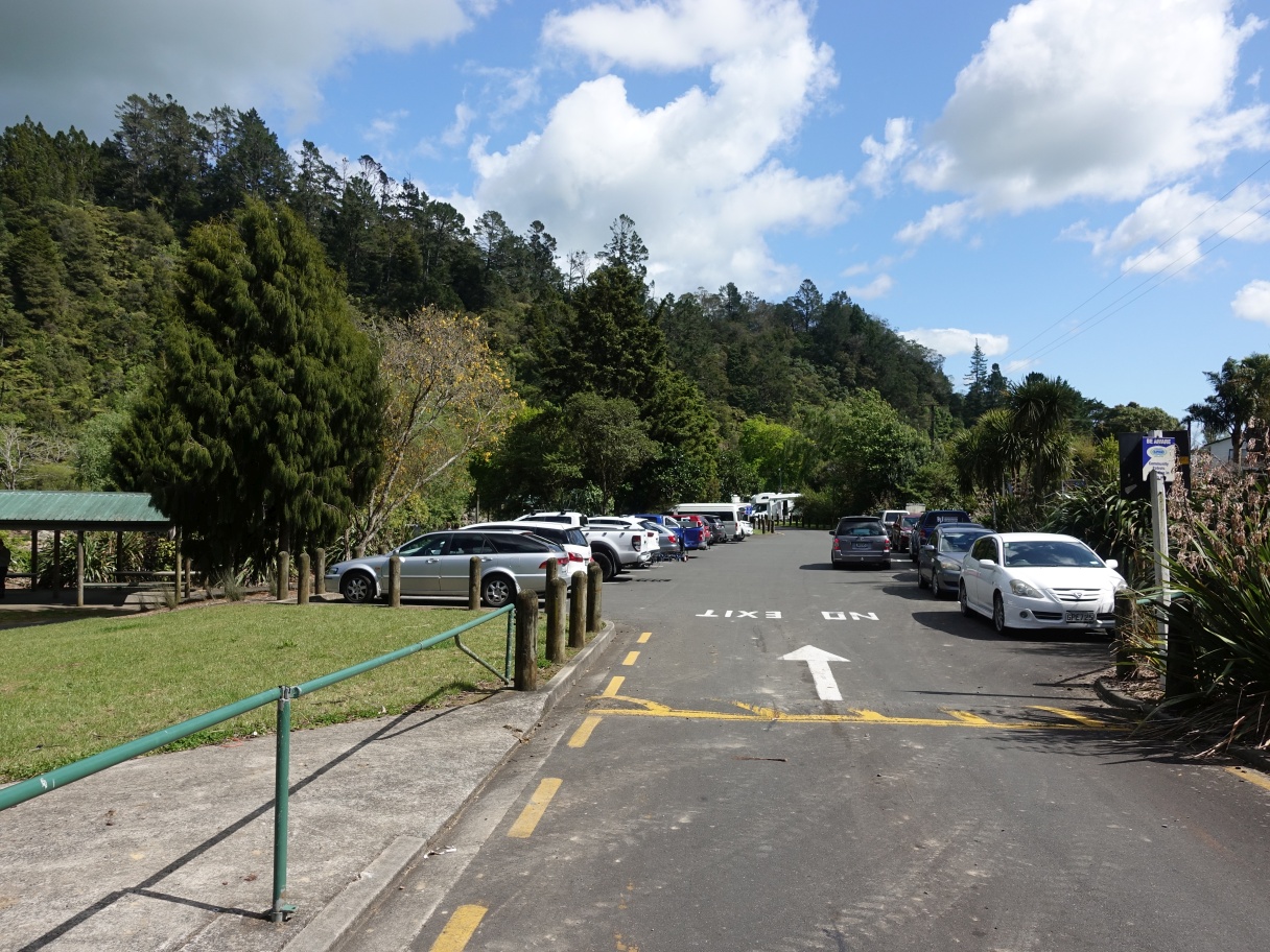 The parking area was completely full, as were the two overflow parking areas further west off SH2, so cars were parked nearby on SH2. The toilets are at the far end of the carpark. SH2 is off picture on the right, with Ohinemuri River on the left.
