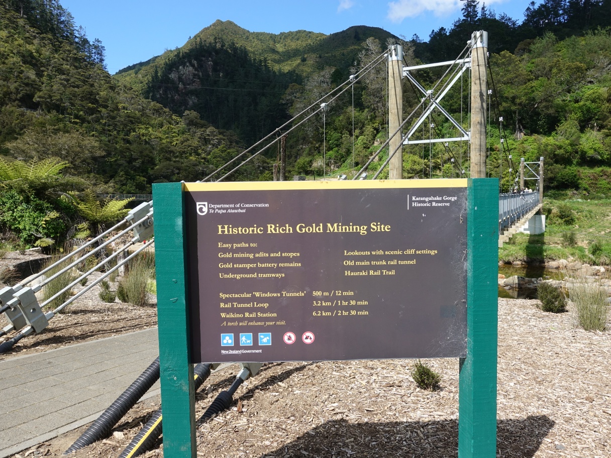 From the carpark there are two suspension bridges to cross to access the Windows Walk. The first suspension bridge, shown here, crosses the Ohinemuri River. The summit of Mount Karangahake is almost directly above the left hand end of the DoC sign.