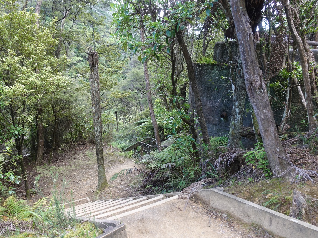 From the exit a set of 72 steps leads down to the track to Dickey’s Flat and to the bridge across Waitawheta River to Crown Tramway track.
