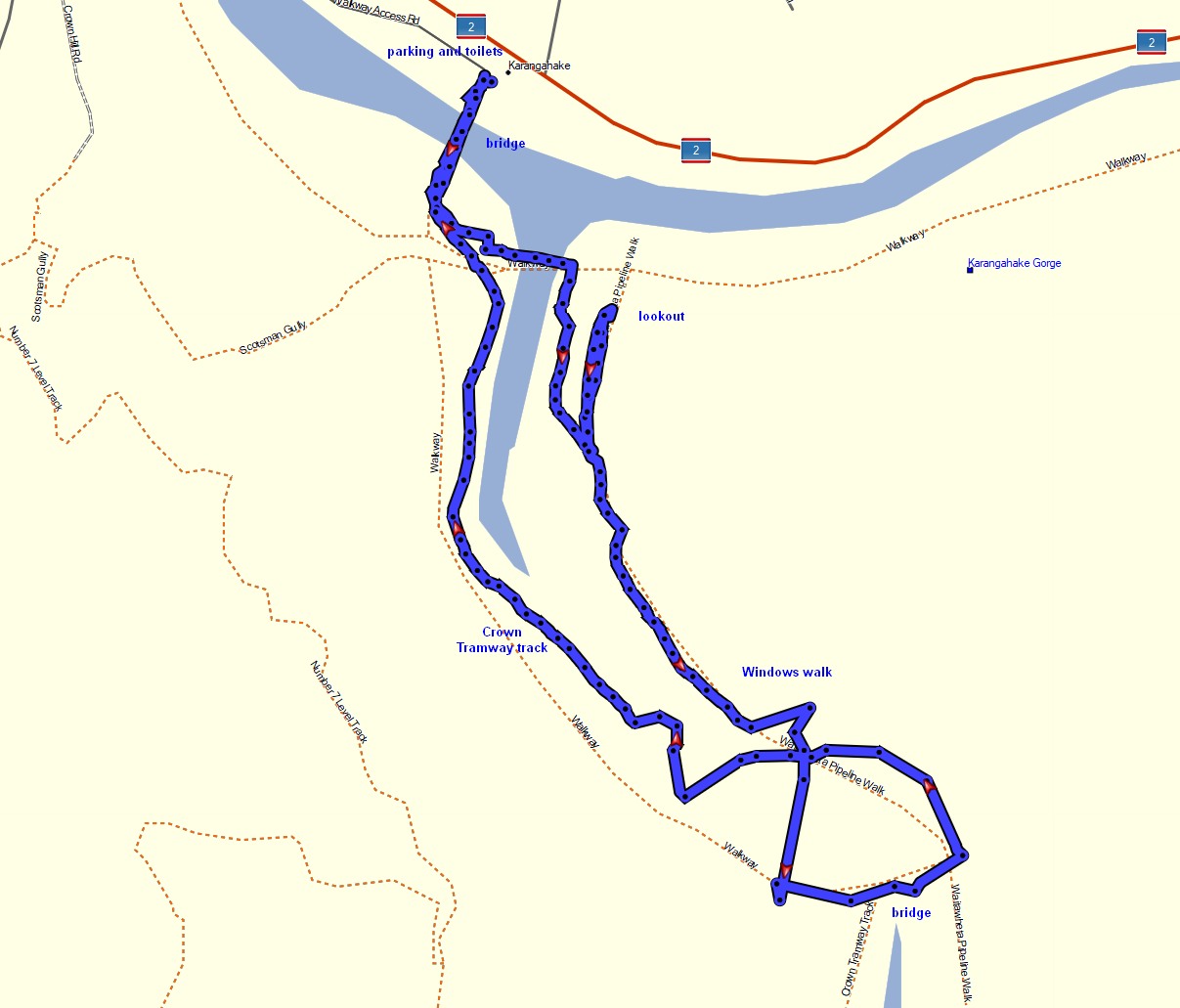 The walk is easily accessible from a parking area off State Highway 2 at the western end of Karangahake Gorge. Toilets are located by the parking area. Information about the walk can be found on the Department of Conservation web site. A torch is very strongly recommended for walking through the mine tunnel with the windows looking into the Waitawheta Gorge. The Crown Tramway Track may be closed during heavy rain or when there have been rockfalls, and the underground pumphouse mentioned on the DoC web site has been closed off for several years now.