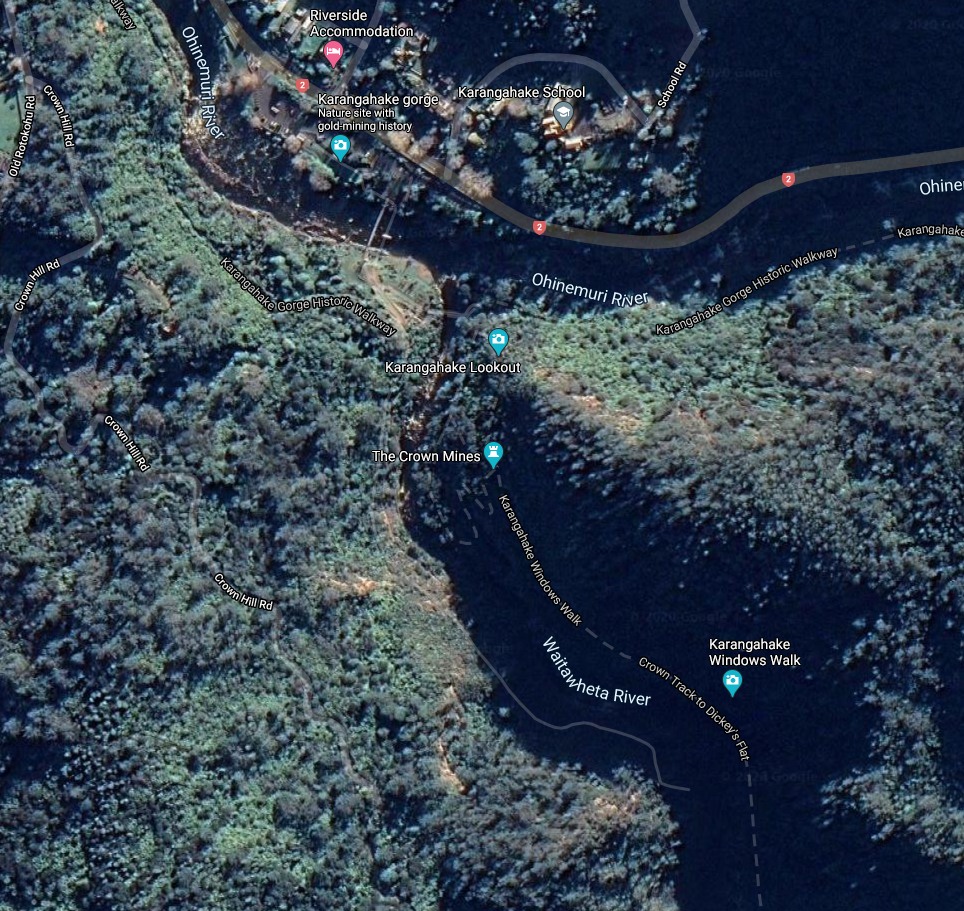 The second suspension bridge, crossing the Waitawheta River, can be seen on the left. Various tracks radiate from this point just after crossing the first bridge.