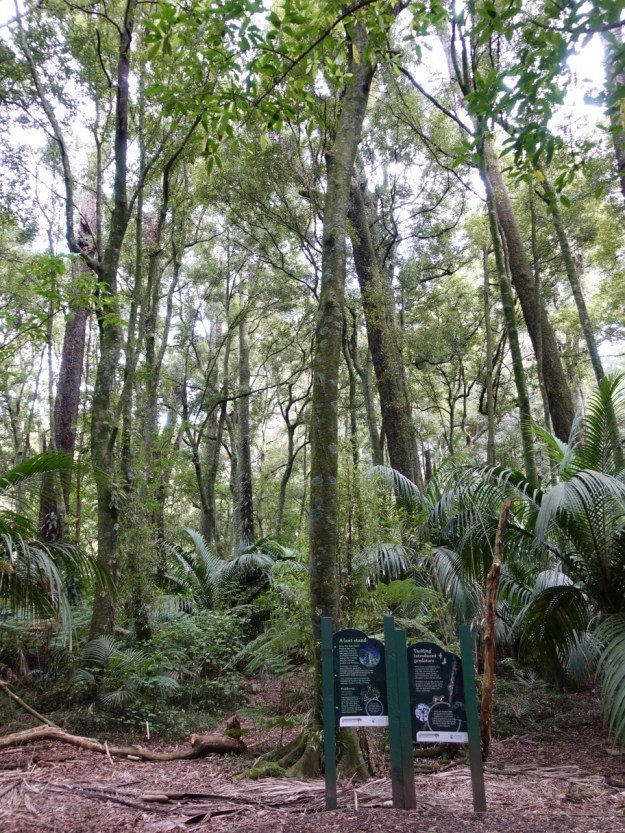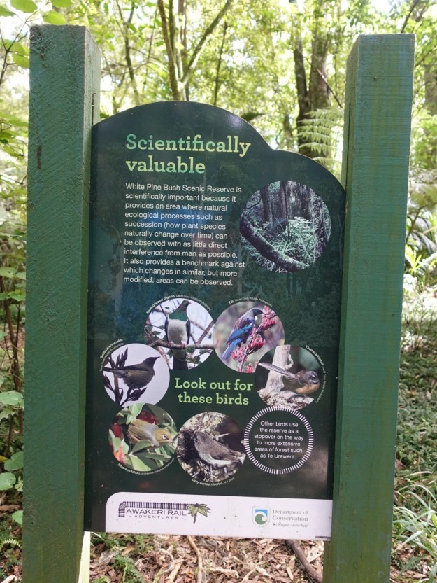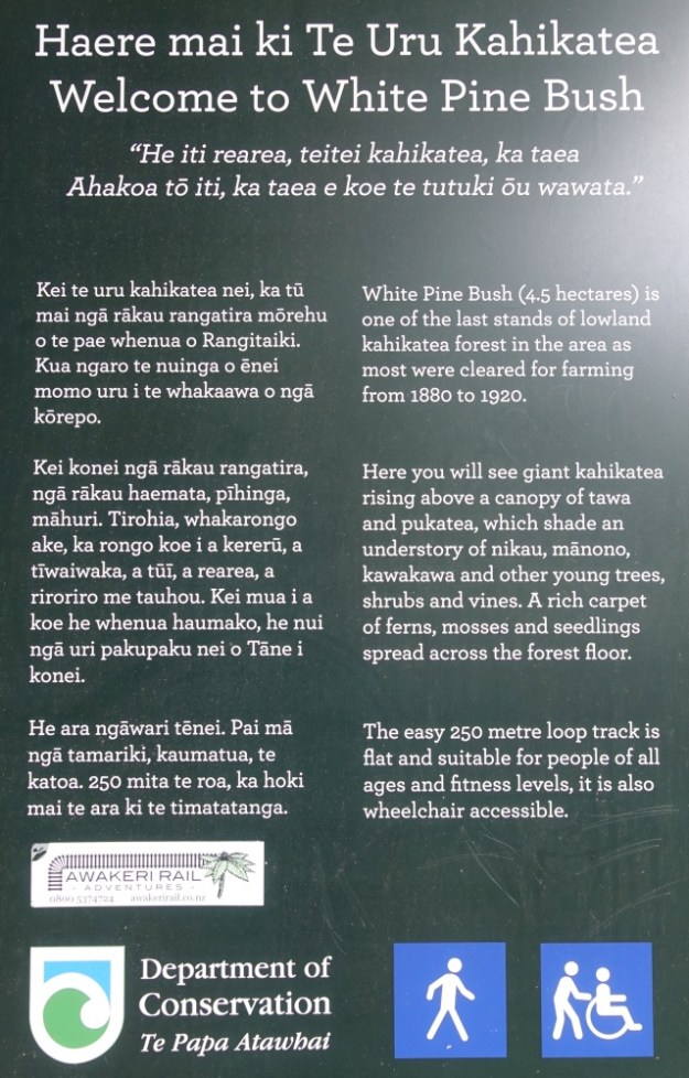 Some of the tallest kahikatea in White Pine Bush can be seen behind the information panels.