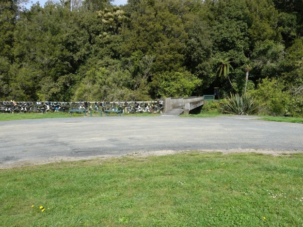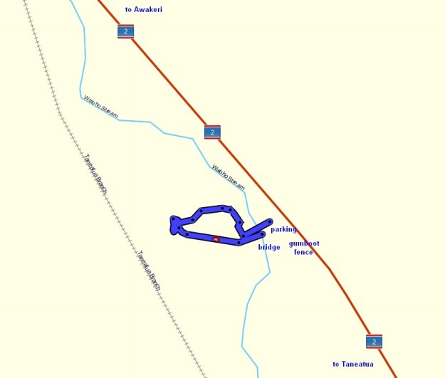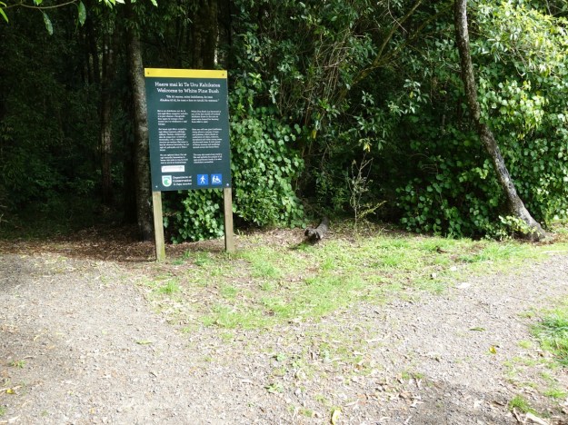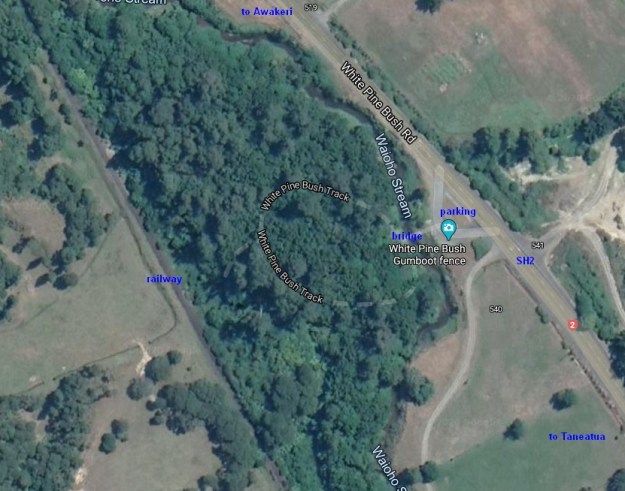 The parking area off SH2, the gumboot fence, the bridge across Waioho Stream, and the entry to the loop walk through White Pine Bush reserve.