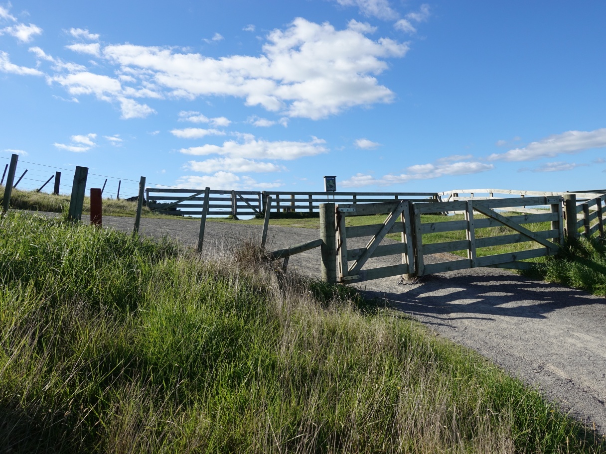 The track, formed as a service road, continues towards the woolshed and its array of photovoltaic solar panels. On a clear day Whakaari/White Island is visible in the distance.