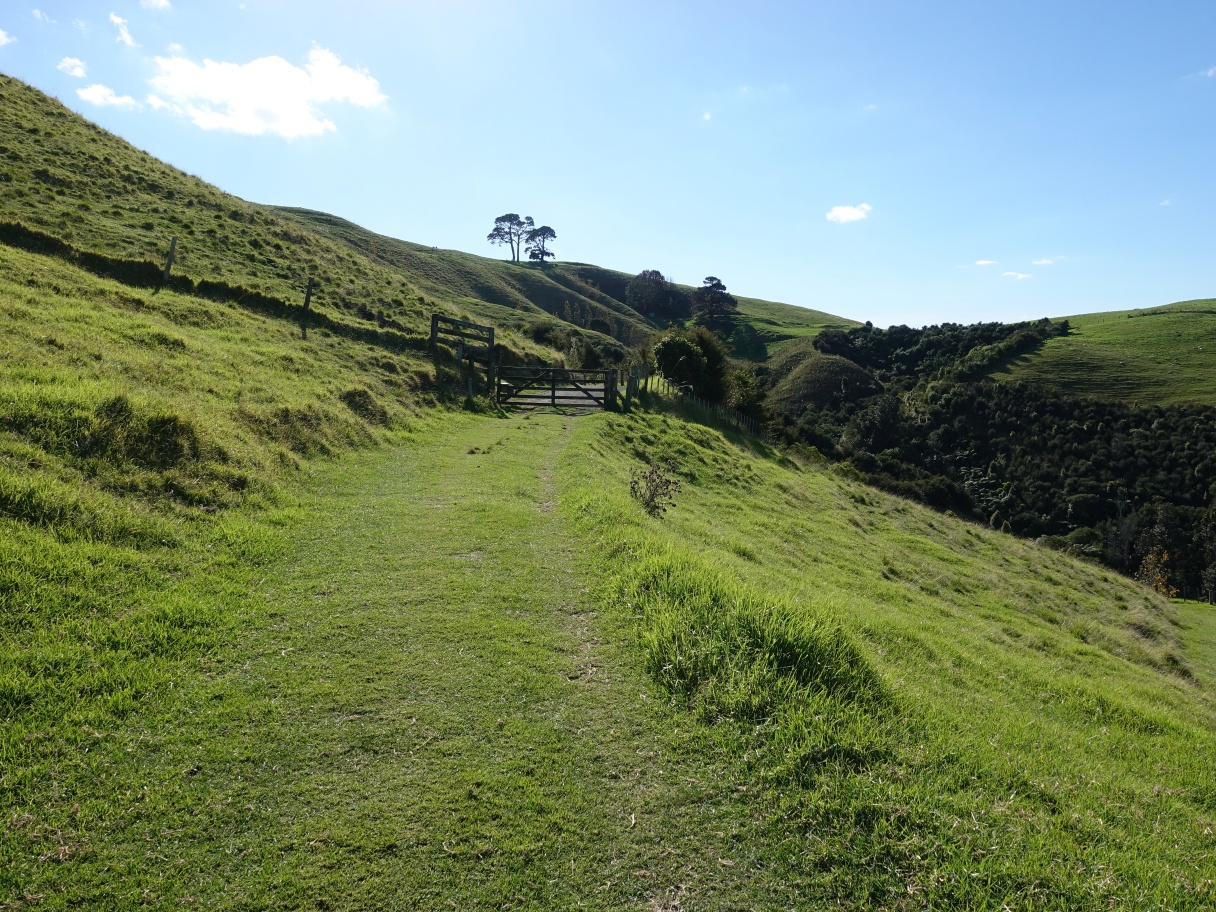 The track exits through a gateway or stile near the service road and with a short track to the left leading to Te Ihu o Ruarangi pa site.