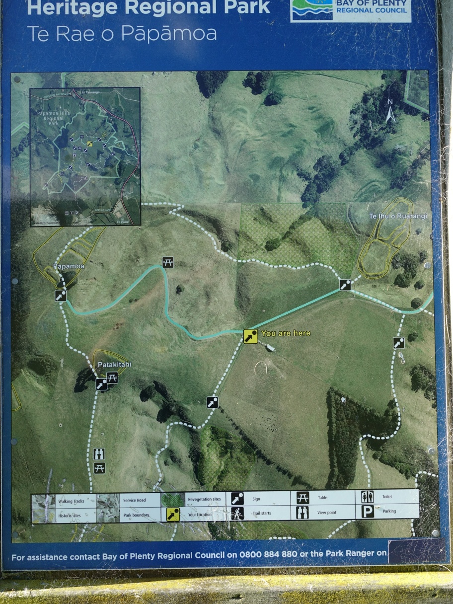 The photo map on the information panel by the carpark shows Te Rae o Papamoa as following a service road at the northern end of the track. The alternative route is more northerly, from the very sharp bend in the track at the north-western corner and alongside the patch of forest and ending at the northern end of what is shown as the Valley Track.
